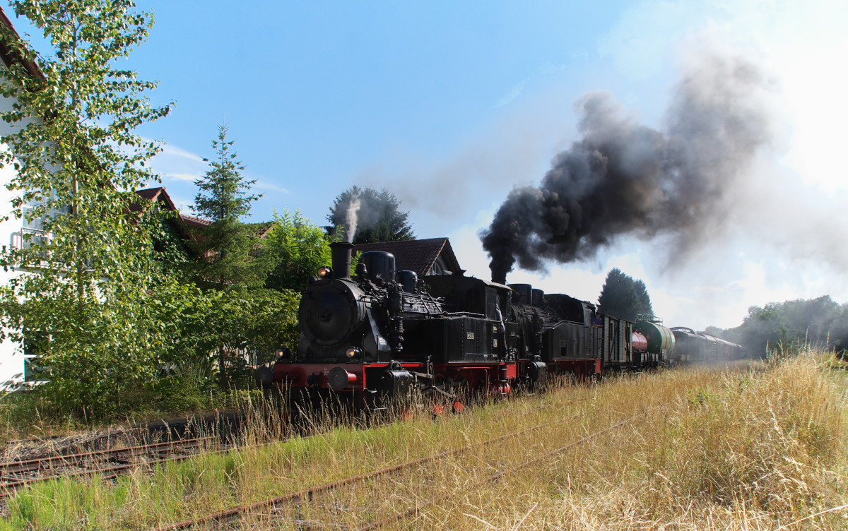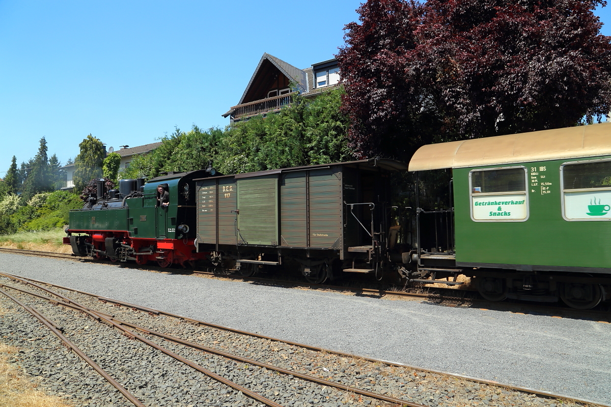 Nachdem 11sm am 05.06.2015 mit ihrem Sonderzug für Eisenbahnfreunde den heutigen Endbahnhof Oberzissen erreicht hat und die Fahrgäste ausgestiegen sind, drückt die Mallet-Lok ihren Zug auch schon wieder zurück, um eine Scheineinfahrt für die Film- und Fotogemeinde durchzuführen.