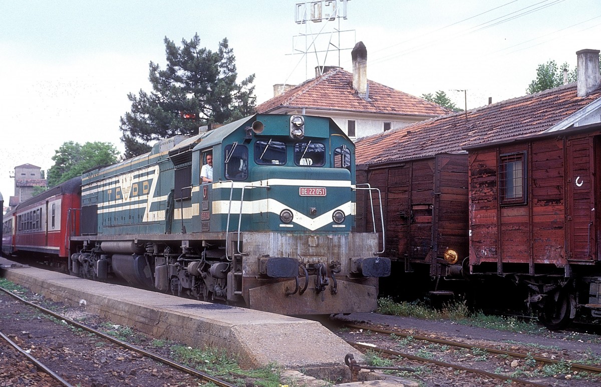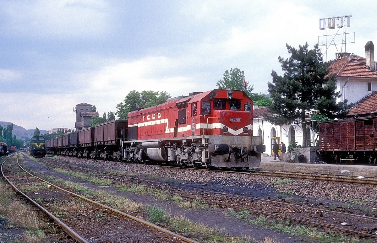 DB 150 mit einem Güterzug Richtung Norden durchfährt am 7.6.1991 den Bahnhof Bebra.