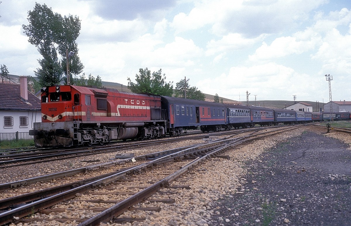 GySEV 651 008 (ex. DR 132 682 / 232 682) mit dem Saison-Schnellzug 19804 von Keszthely kurz nach Sümeg. Links von der Lok ist die Burg von Sümeg zu sehen.