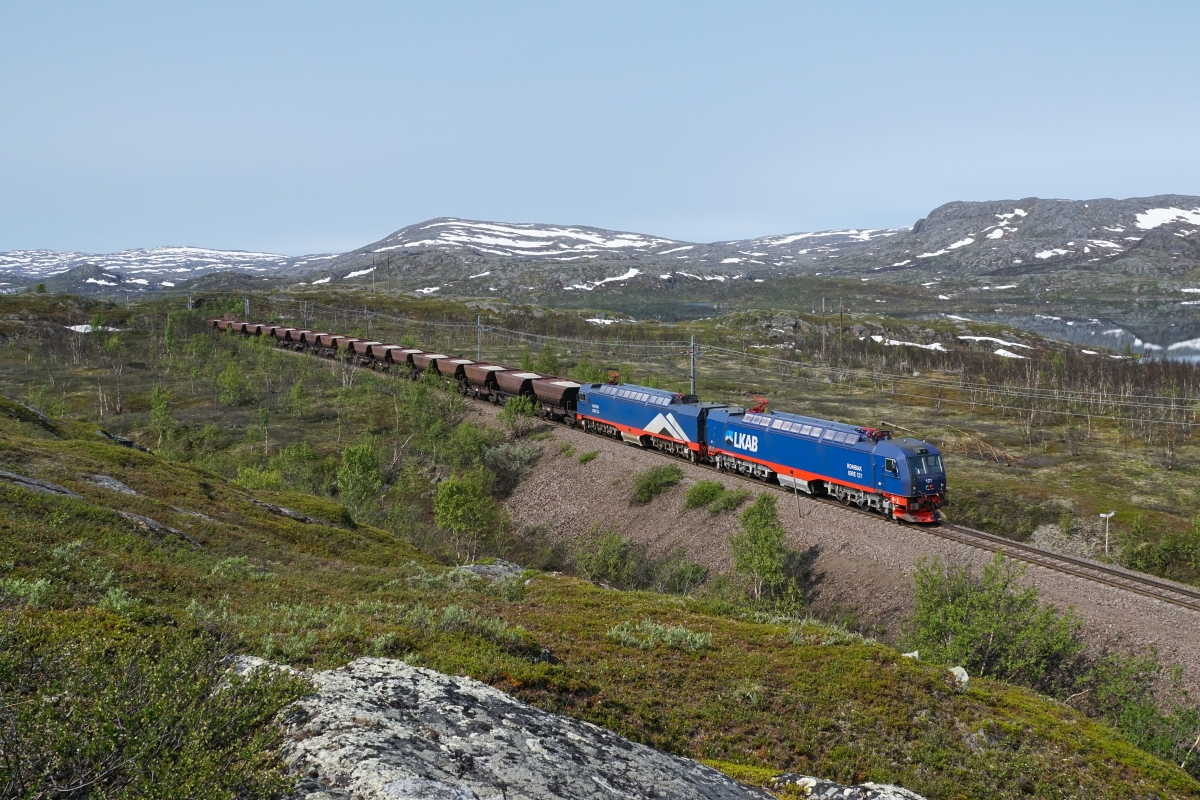 Sommerferien in Skandinavien, 2. Teil: An der Malmbahn: IORE 121 und IORE 124 fahren am 12.07.2015 von Katterjakk Richtung Vassijaure. Die Züge von Narvik nach Kiruna verkehren grundsätzlich leer, bei diesem Zug allerdings waren die ersten Wagen mit Olivin, welches zur Herstellung von Eisenerzpellez verwendet wird, beladen.