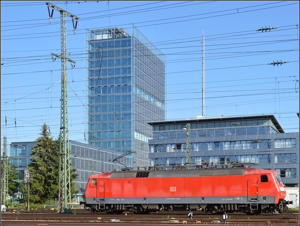 Vor dem Hegau-Tower -durch einen Star-Architekten designt und immer in der Farbe des Himmels- muss natürlich auch das Protrait der 120 152-4 ein wenig ungewöhnlich gestylt sein... Singen, August 2015.