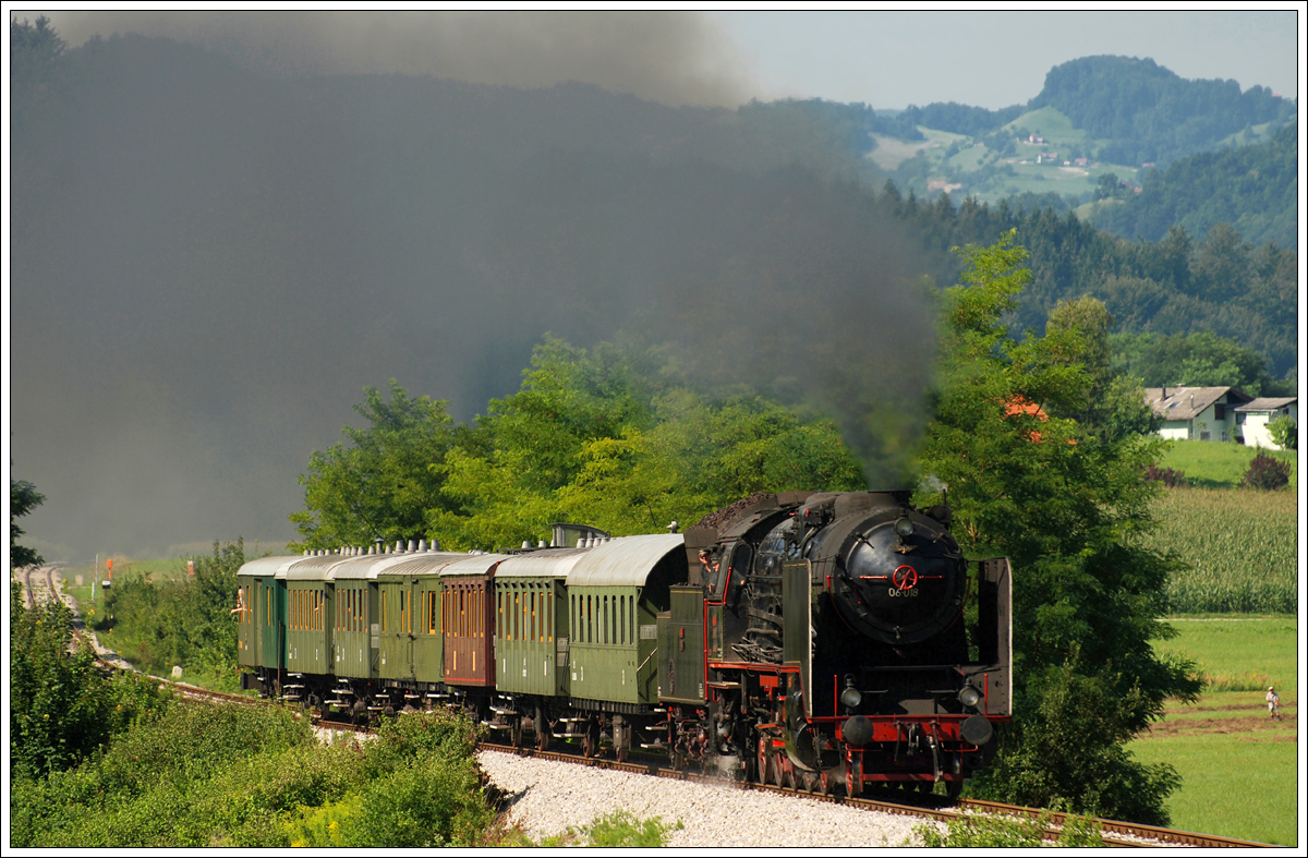 06-018 mit ihrem UEx 13420 von Celje nach Imeno am 1.8.2015 bei der Ausfahrt aus Stranje. Dank eines außerplanmäßigen Halt in Stranje zwecks Lagerkontrolle ging sich diese Aufnahme aus ;-)