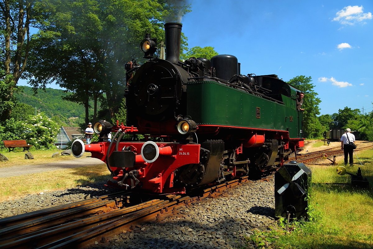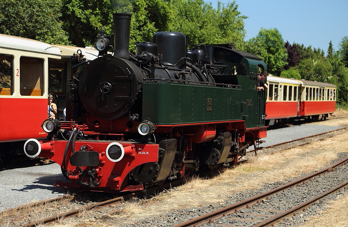 Nach erfolgter Scheineinfahrt, setzt Mallet 11sm, am 05.06.2015 im Bahnhof Oberzissen, jetzt für die Rückfahrt nach Brohl-Lützing um.