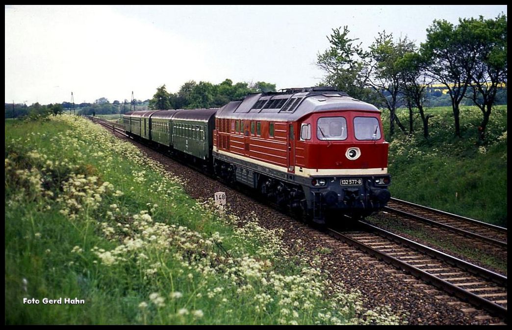 132577 war am 7.6.1991 um 16.08 Uhr bei Fröttstädt mit dem P 6528 in Richtung Erfurt unterwegs.