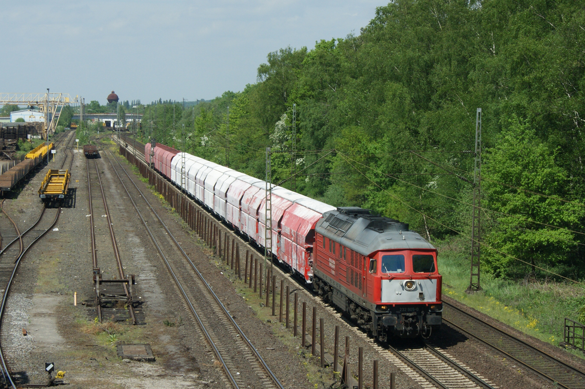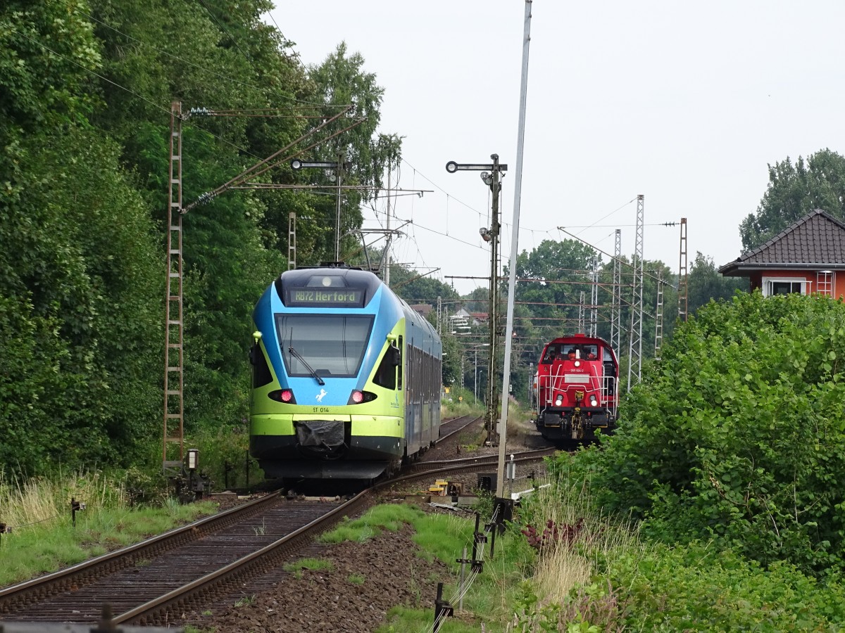 Die Gravita 265 004 wartet mit ihrer Übergabe zu den Kronospan-Werken im Bahnhof Leopoldstal die Zugkreuzung mit der Westfalenbahn nach Herford ab.