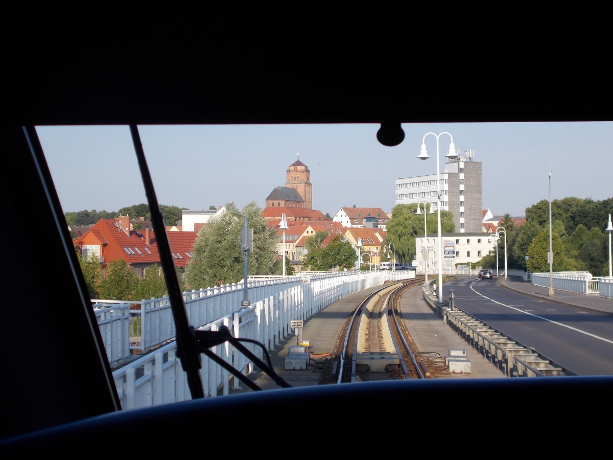 Bevor die UBB den Peenestrom überquert,ergibt sich aus dem Rückfenster den Blick auf die Stadtkulisse von Wolgast.Aufnahme vom 02.August 2015.