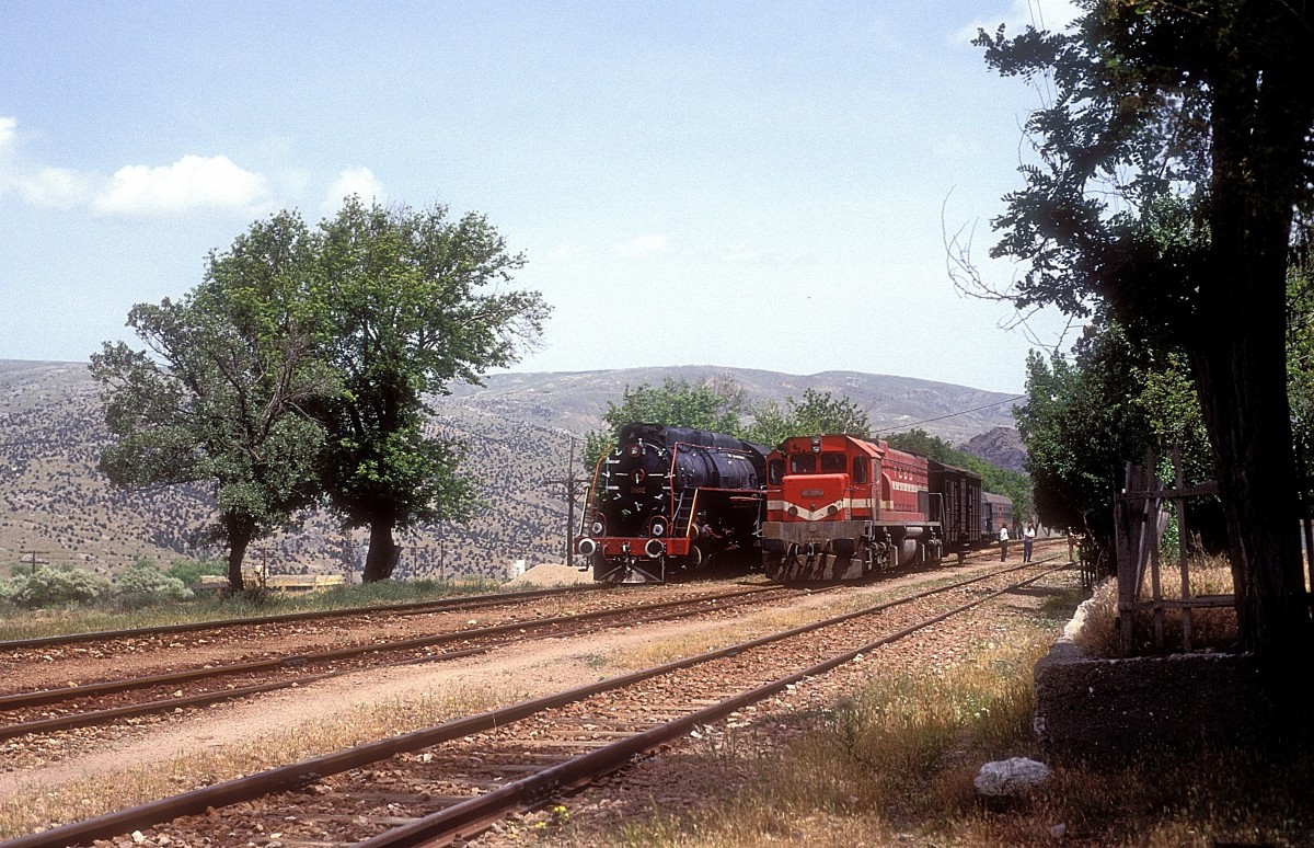 Die beiden Dieseloks BB 66 497 und 594 nähern sich von der anderen Seite dem Zug 5753, welcher aus drei B (davon ein deklassierter Eurofima A) und einem AB besteht und in der Fahrplanperiode 2000/2001 am 23., 30 XII 2000, 6I , 10, 17. und 24 II 2001 verkehrte.