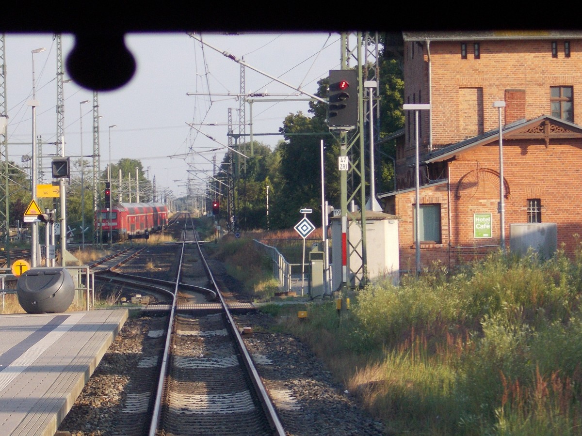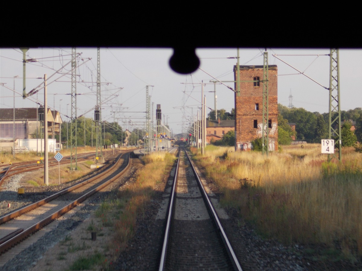 Der Bahnhof Züssow,am 02.August 2015,mit einem ausfahrenden RE nach Stralsund aus der Sicht vom UBB Führerstand.Da ich das Glück hatte bis Heringsdorf freie Sicht aus dem Rückfenster zuhaben,konnte ich so einige Aufnahmen machen.