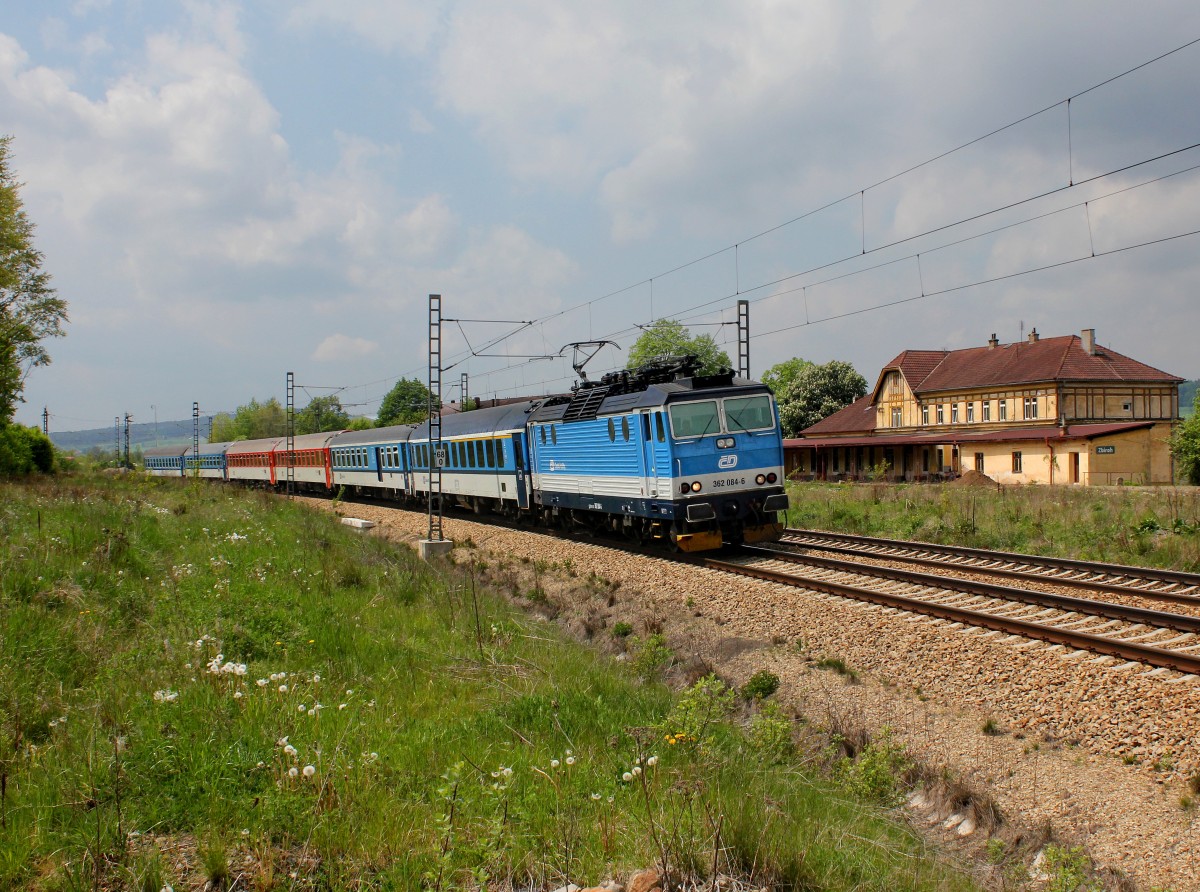 Die 362 084 mit einem Rx nach Prag am 14.05.2015 unterwegs bei Zbiroh.
