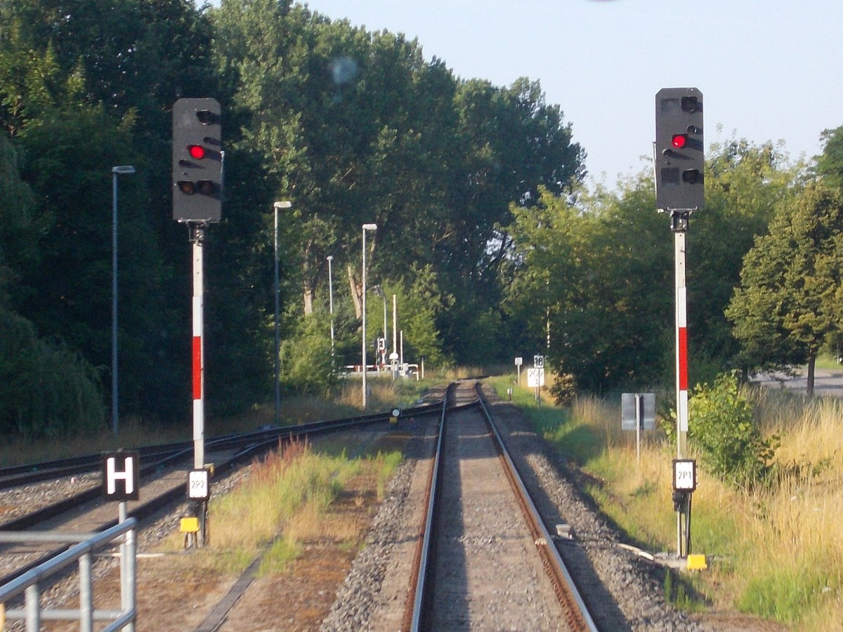 Die Ausfahrsignale von Wolgast in Richtung Züssow am 02.August 2015,Aufnahme aus einen UBB Rückfenster.