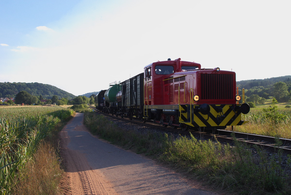 Eine frische Hauptuntersuchung hat Lok 51 (ex MBE) der MECL bekommen. Die Lok wurde 1959 als Nr.12995 bei Jung in Jungenthal gebaut. Am 01.08.2015 kam Sie zu Fotozugehren. Viele Besucher aus Nah und Fern waren an der Strecke. Wir hatten uns allerdings bei Bachem ein weiteres ruhiges Plätzchen ausgesucht! Durch vielen Züge mit Dampf und Diesel kam der Fahrplan doch etwas durcheinander, sodass der Zug erst gegen 19.30 in Richtung Losheim an uns vorbei knatterte. Bahnstrecke 9321 Merzig - Büschfeld.