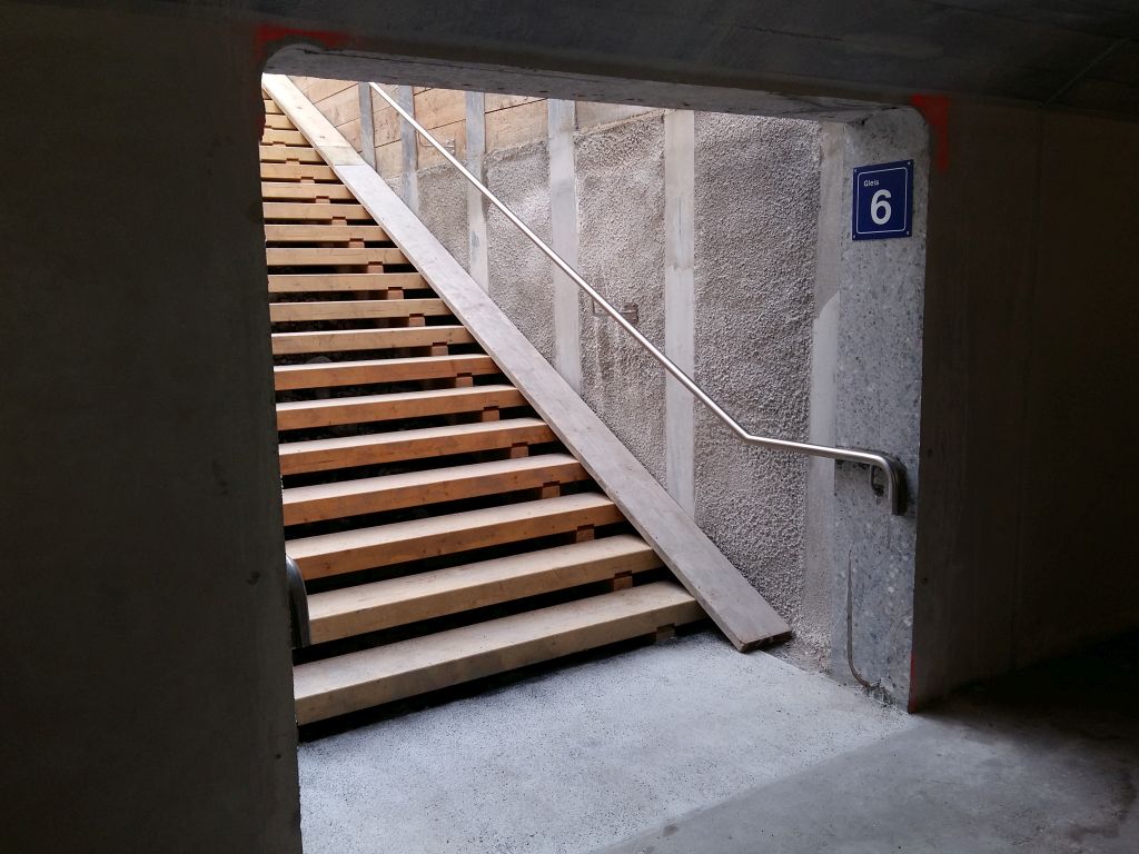 In Othmarsingen wurde für den Umbau ein Hilfsperron (Bahnsteig) gebaut. Hier der prov. Aufgang 4.8.2015