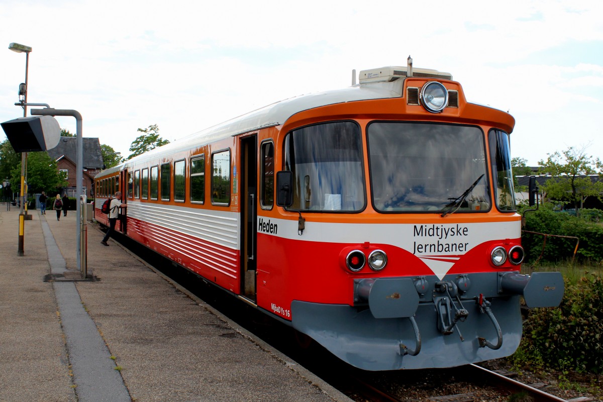 Midtjyske Jernbaner Lemvigbanen: MjbaD Ys 16 + Ym 16 Bahnhof Vemb am 9. Juni 2015. - Züge dieses Typs (Ym(-Yp)-Ys) gab es viele Jahre auf den dänischen Privatbahnen. Die DSB benutzte einen ähnlichen Typ (Serie ML (Triebwagen) 4901 - 4907 und Serie FL (Mittelwagen) 7901 - 7905) auf der Bahnstrecke Hillerød - Fredensborg - Helsingør.