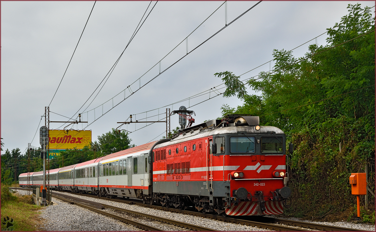 SŽ 342-023 zieht EC158 durch Maribor-Tabor Richtung Wien. /3.8.2015