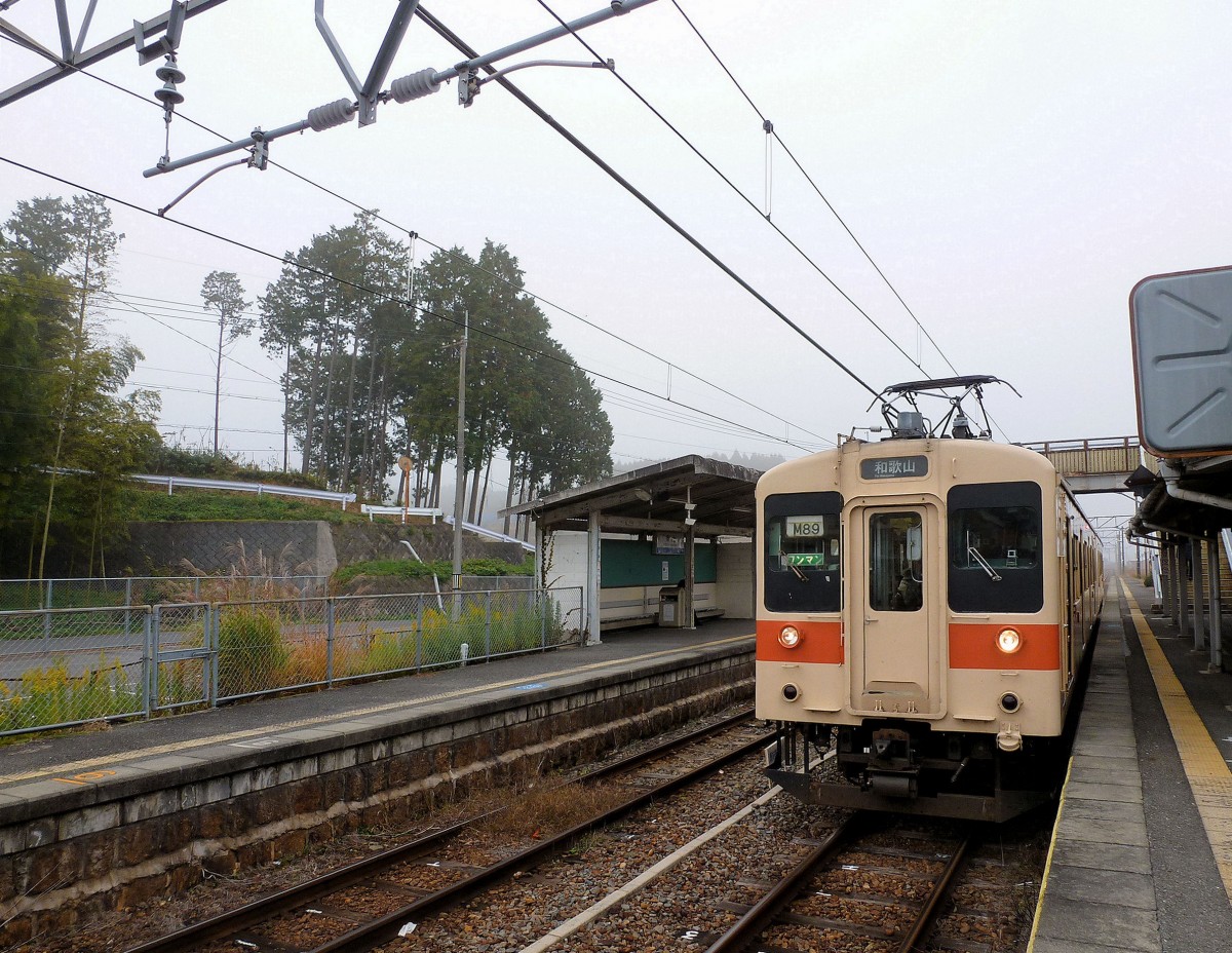 Serie 105 (4-türig): Um den Bestand an einfachen Gleichstromzügen zu erweitern wurde 1984 die Gelegenheit genutzt, im Tokyo-S-Bahnverkehr nicht mehr benötigte Zehnwagenzüge auseinanderzunehmen und als Zweiwagenzüge in die Serie 105 einzugliedern. Diese Züge haben 4 Einstiegstüren. So entstanden für westjapanische Lokallinien 30 weitere Steuerwagen und 32 weitere Motorwagen mit Führerstand; ein Teil der Steuerwagen sind ent-motorisierte alte Zwischenwagen mit neuen Führerständen. Im Bild fährt ein Zug mit Steuerwagen KUHA 105-13 und Motorwagen KUMOHA 105-523 in Wakigami in den Bergen der Kii-Halbinsel südlich von Osaka ein. KUHA 105-13 ist ein Original-Steuerwagen (Serie 103-1000) des S-Bahnbetriebs Tokyo. An einem nebligen 3.Dezember 2012.