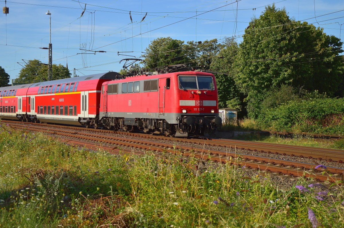 111 127-7 zieht hier einen RE4 aus Rheydt Hbf gen Aachen aus. 6.8.2015
