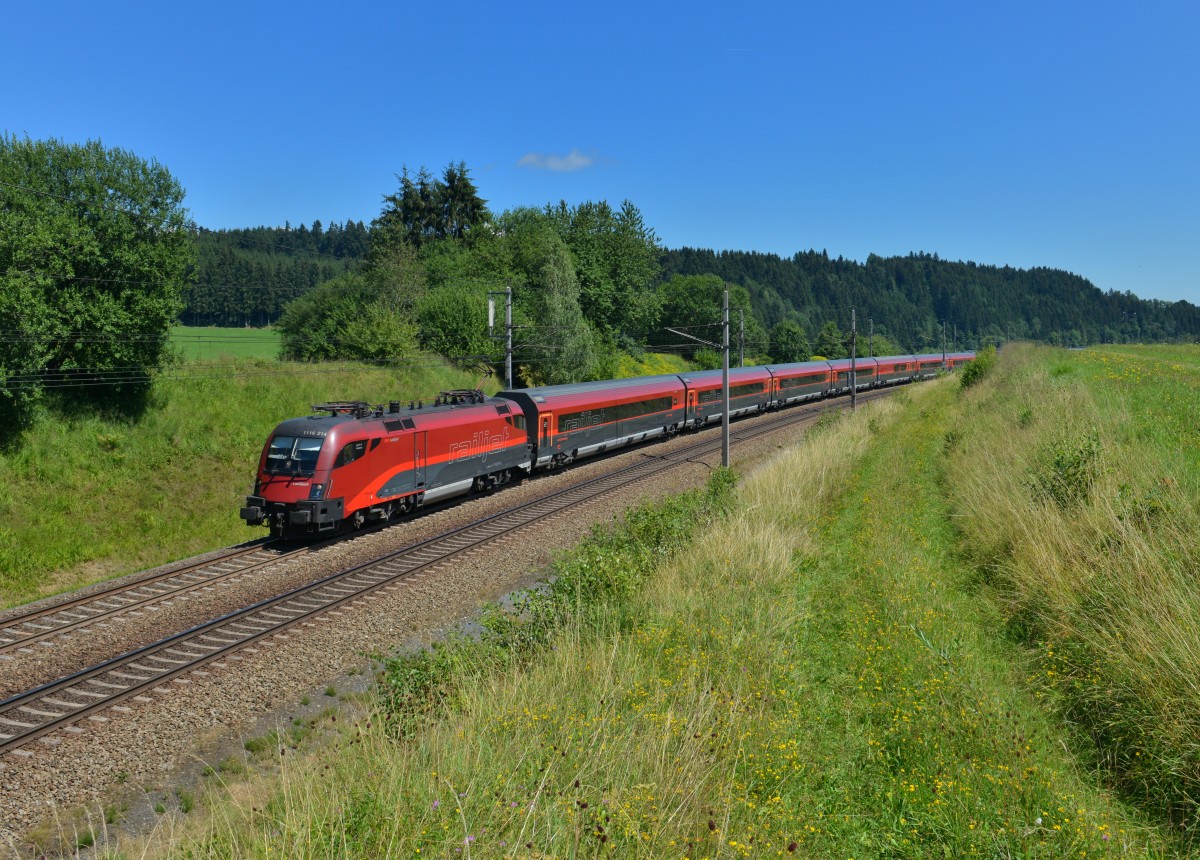 Ausblick auf den Wiener Westbahnhof, am Nachmittag des 01.08.2015. Railjet 760 und die BR 1063 023.