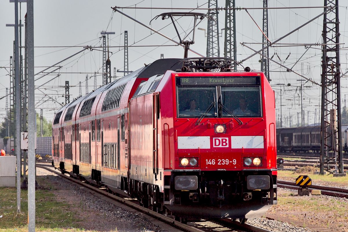 146 239-9 trifft mit dem IRE nach Konstanz im Bf Offenburg ein.Bild vom 7.8.2015