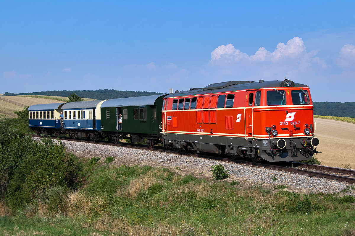 2143 070, war am 08.08.2015, an einem extrem heißen Sommernachmittag mit dem Nostalgie Express "Leiser Berge" von Ernstbrunn nach Wien Praterstern unterwegs. Diese Aufnahme entstand kurz vor Würnitz-Hetzmannsdorf.
