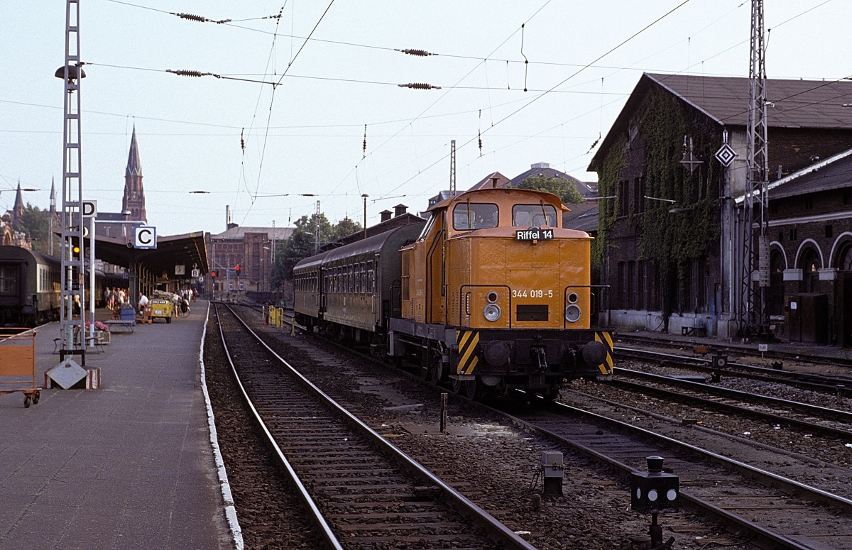 112594 am 7.6.1991 um 14.02 Uhr vor einem Personenzug im Bahnhof Glauchau.