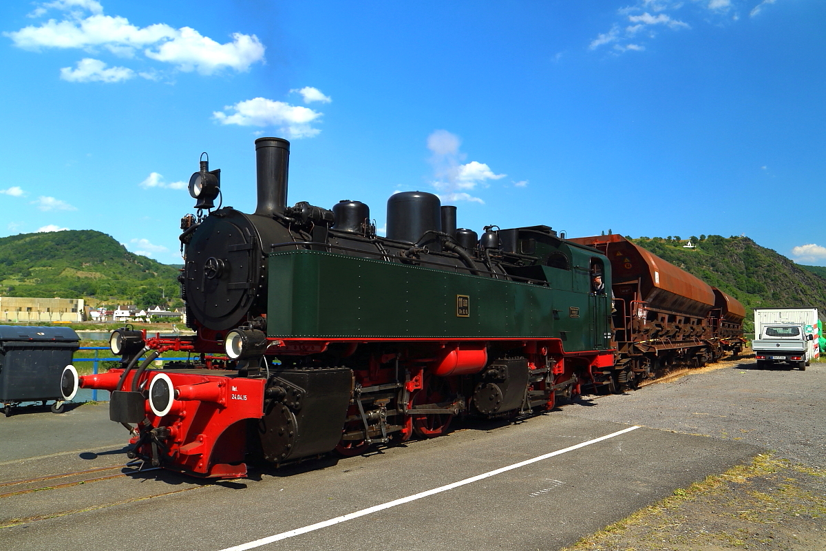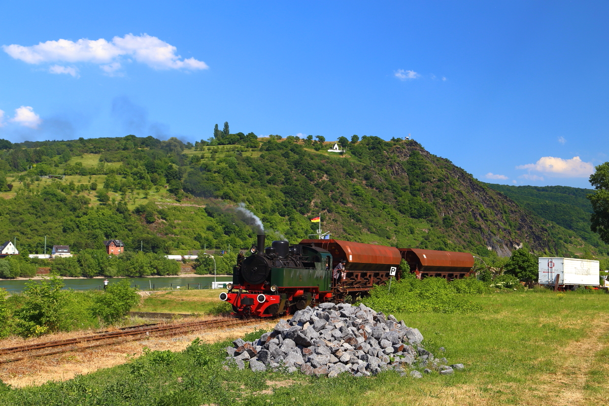 Bei der Veranstaltung mit 11sm am 05.06.2015 gab es zahlreiche Fotohalte. Dies ist einer von ihnen. Die Lok befindet sich mit ihrer Rangiereinheit aus zwei Regelspurwaggons gerade in den Brohler Rheinanlagen. Als Kulisse dient hier das Rheinbrohler Ley, auf welchem sich die Gedenkstätte für die tausenden Gefallenen des 29. Infanterieregiments aus dem 1.Weltkrieg befindet (weißes Gebäude in der Bergmitte).