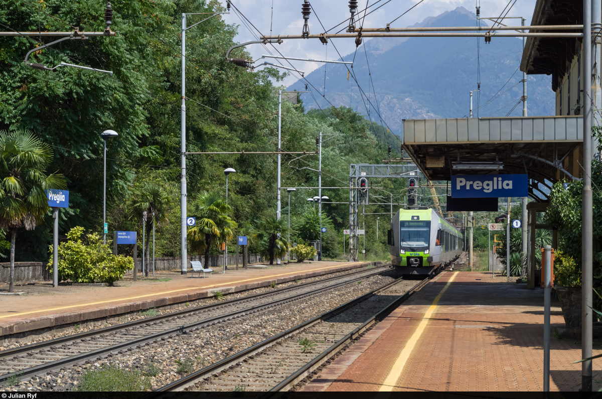 Ein Lötschberger erreicht am 8. August 2015 den Bahnhof Preglia. Die Lötschberger wurden an den Wochenenden 1./2. sowie 8./9. August bis Domodossola verlängert. Ab 2017 möchte die BLS die Verlängerung in das Grundangebot aufnehmen.