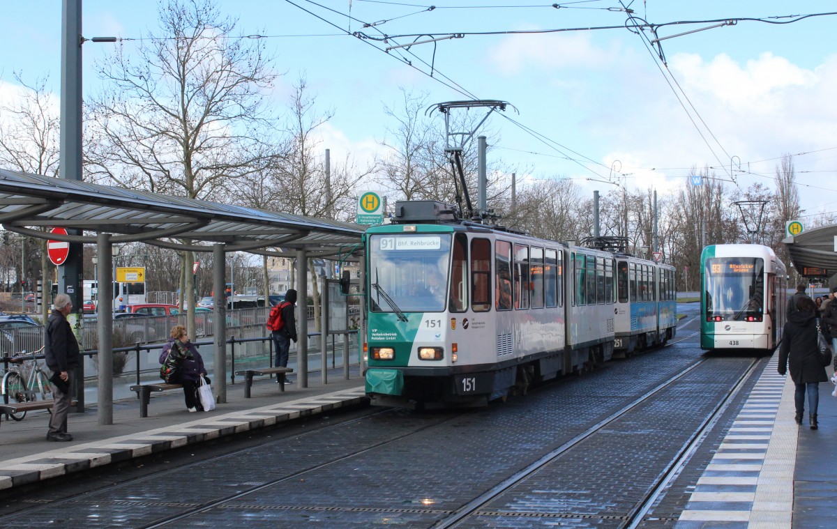 Potsdam VIP SL 91 (KT4DC 151 + 251) Hauptbahnhof am 2. April 2015. - Rechts im Hintergrund ahnt man den Stadler-Vario 438 auf der SL 93.
