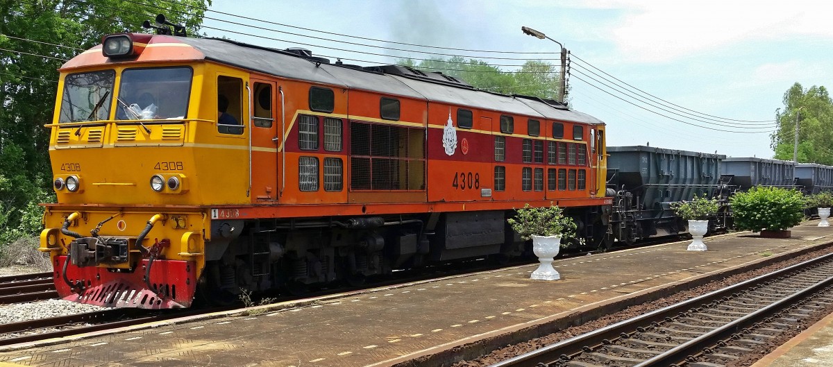 SRT 4308 mit einem kurzen Schüttgutwagenzug verläßt am 24.07.15 den Bahnhof Wang Phong nach einer Zugkreuzung in Richtung Bangkok.