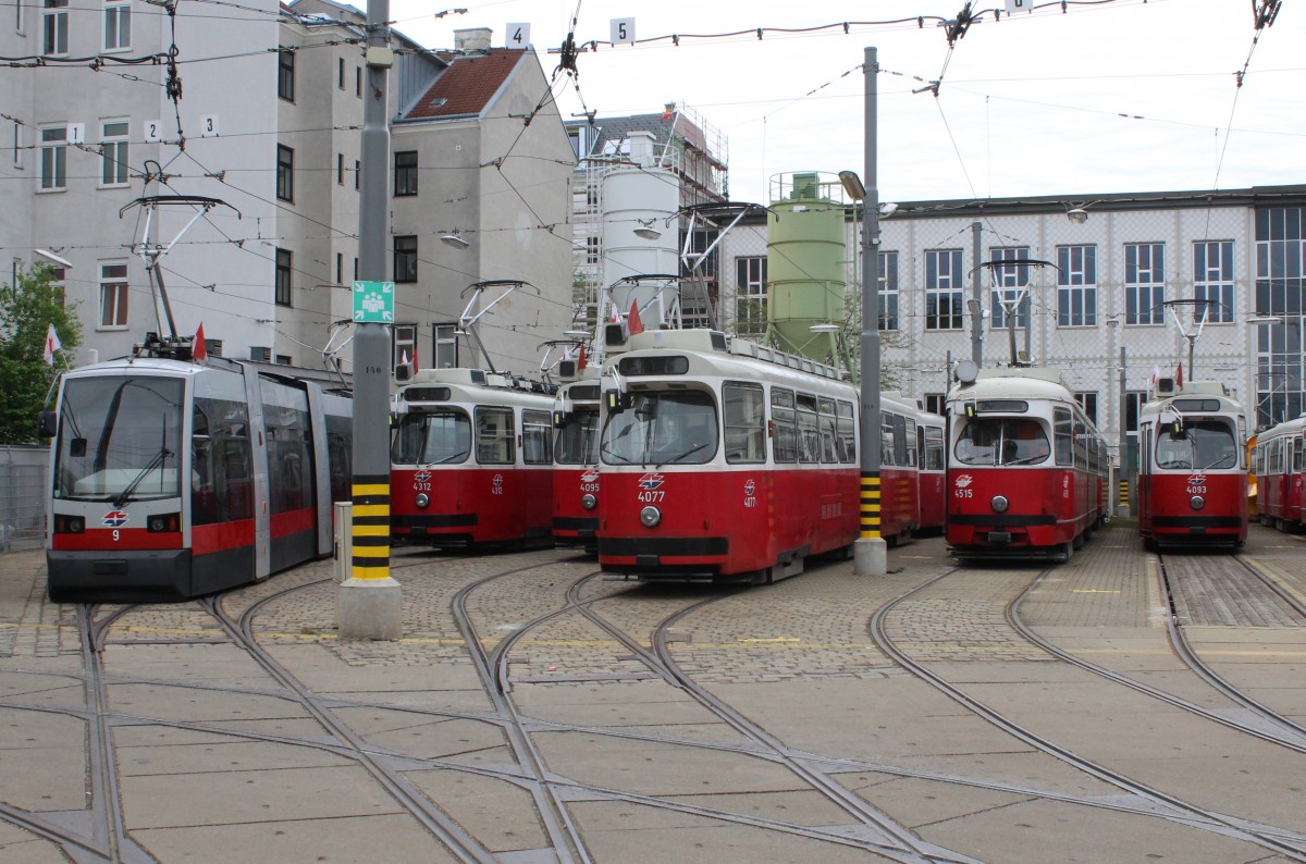 Wien Wiener Linien: Im Betriebsbahnhof Favoriten halten am Morgen des 1. Mai 2015 die Wagen A 9, E2 4312, E2 4095, E2 4077, E1 4515 und E2 4093.