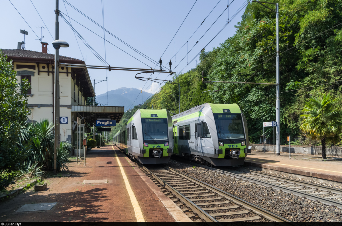 Zwei Lötschberger kreuzen sich am 8. August 2015 im Bahnhof Preglia. Was im Jahr 2015 nur an zwei Wochenenden vorkommt, soll ab 2017 Standard werden, wenn es nach der BLS geht. Diese plant, die bis dahin den SBB gehörende Konzession für den Regionalverkehr zwischen Brig und Domodossola zu übernehmen und die stündlich verkehrenden Lötschberger Bern-Spiez-Lötschberg Bergstrecke-Brig bis nach Domodossola zu verlängern.