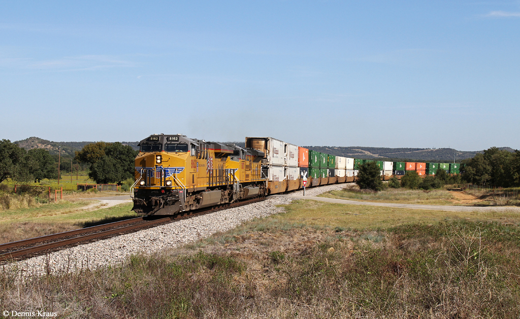 UP 8162 (ES44AC) + 8870 (SD70AH) mit Containerzug am 06.10.2015 bei Santo, Texas.