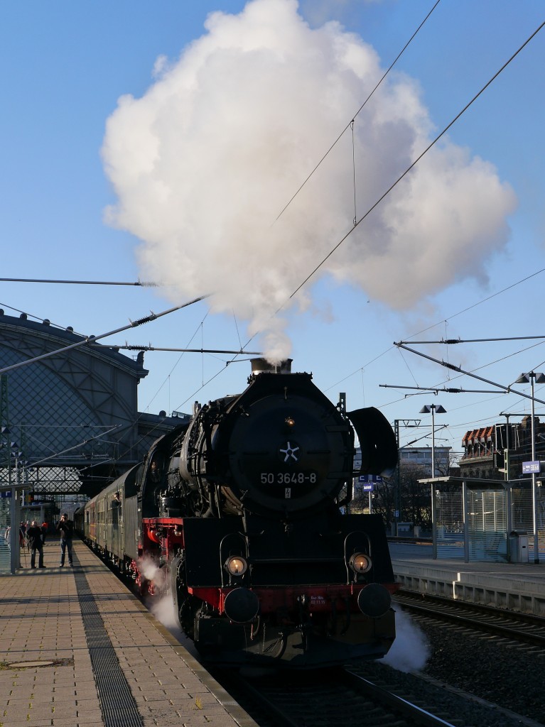 Weil die DB zum Fahrplanwechsel 13.12.2015 den Verkehr auf der Strecke Dresden - Döbeln - Leipzig einstellt, hat die IG Damplok Nossen eine Abschiedsfahrt veranstaltet. Die Chemnitzer 50 3648 mit dem Sonderzug bei Einfahrt in Dresden-Neustadt, 06.12.2015