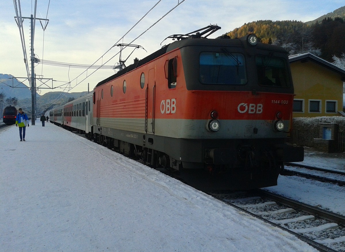 Die Funken sprühen beim Stromabnehmer der 1144 003-1, bei der Ausfahrt aus dem frostigen Bahnhof Dellach im Drautal. Aufgenommen 11.12.2015