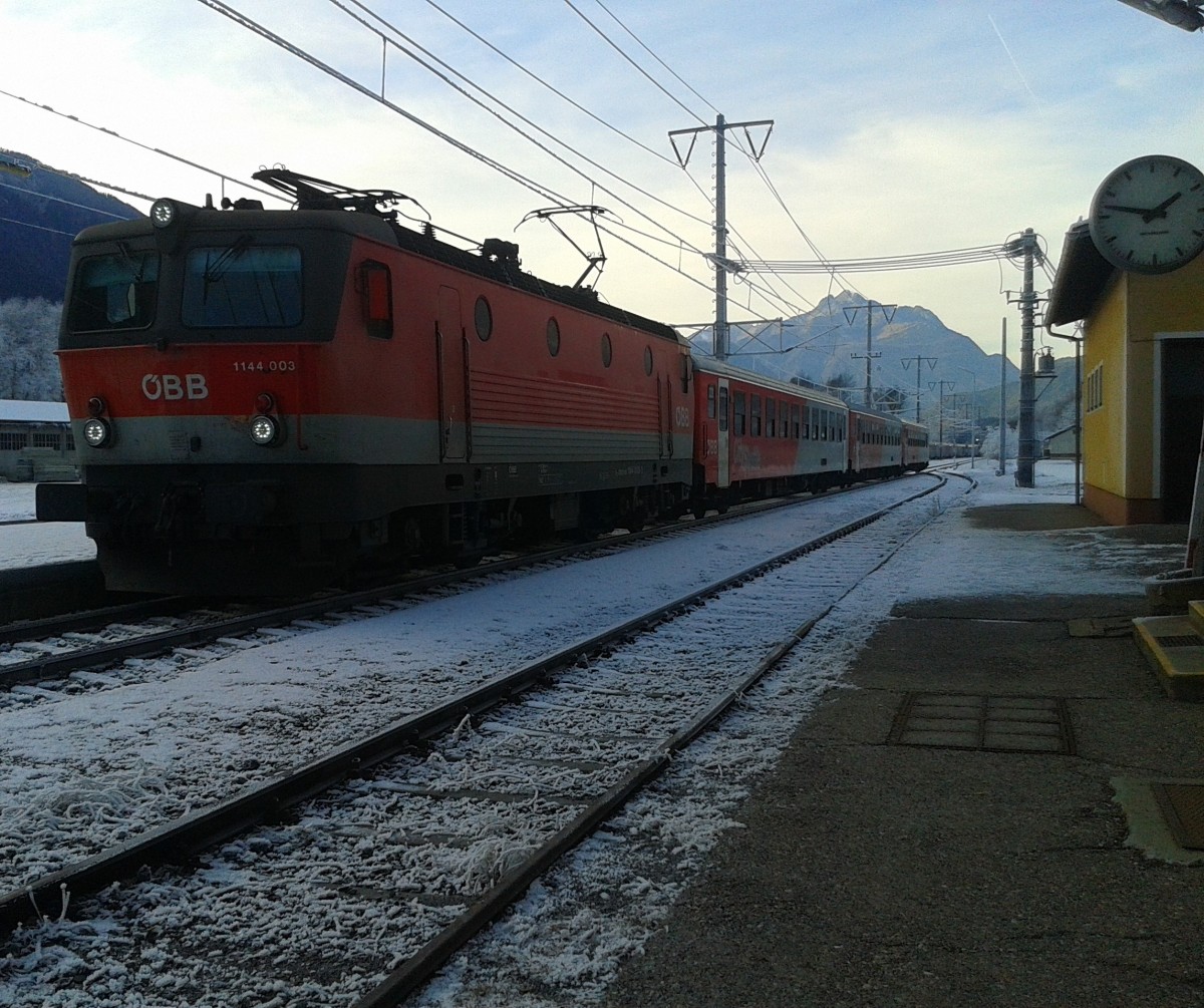 Die Funken sprühen beim Stromabnehmer der 1144 003-1, bei der Ausfahrt aus dem frostigen Bahnhof Dellach im Drautal.