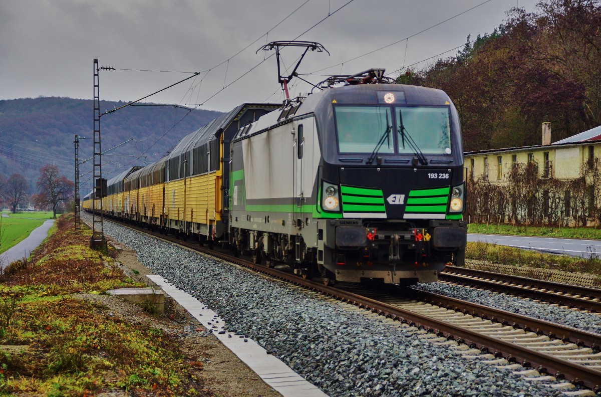 X 4E-855 (193 855) von MRCE ist in der Nachmittagssonne mit einen Autozug (Audi) der in Richtung Norden unterwegs ist abgelichtet bei Gambach 09.12.15.