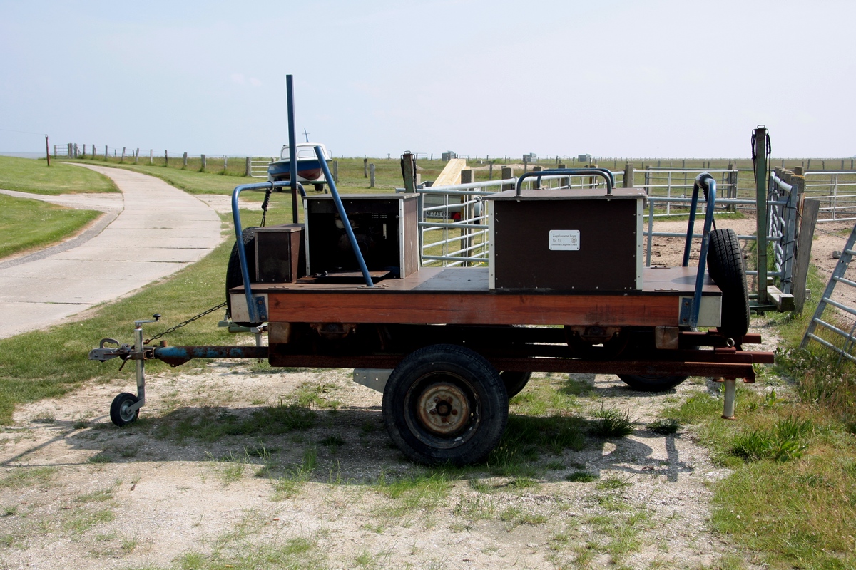 Lore 51 auf Transportwagen, abgestellt vor der Warf Norderhörn. (Langeness, 12.06.2012)