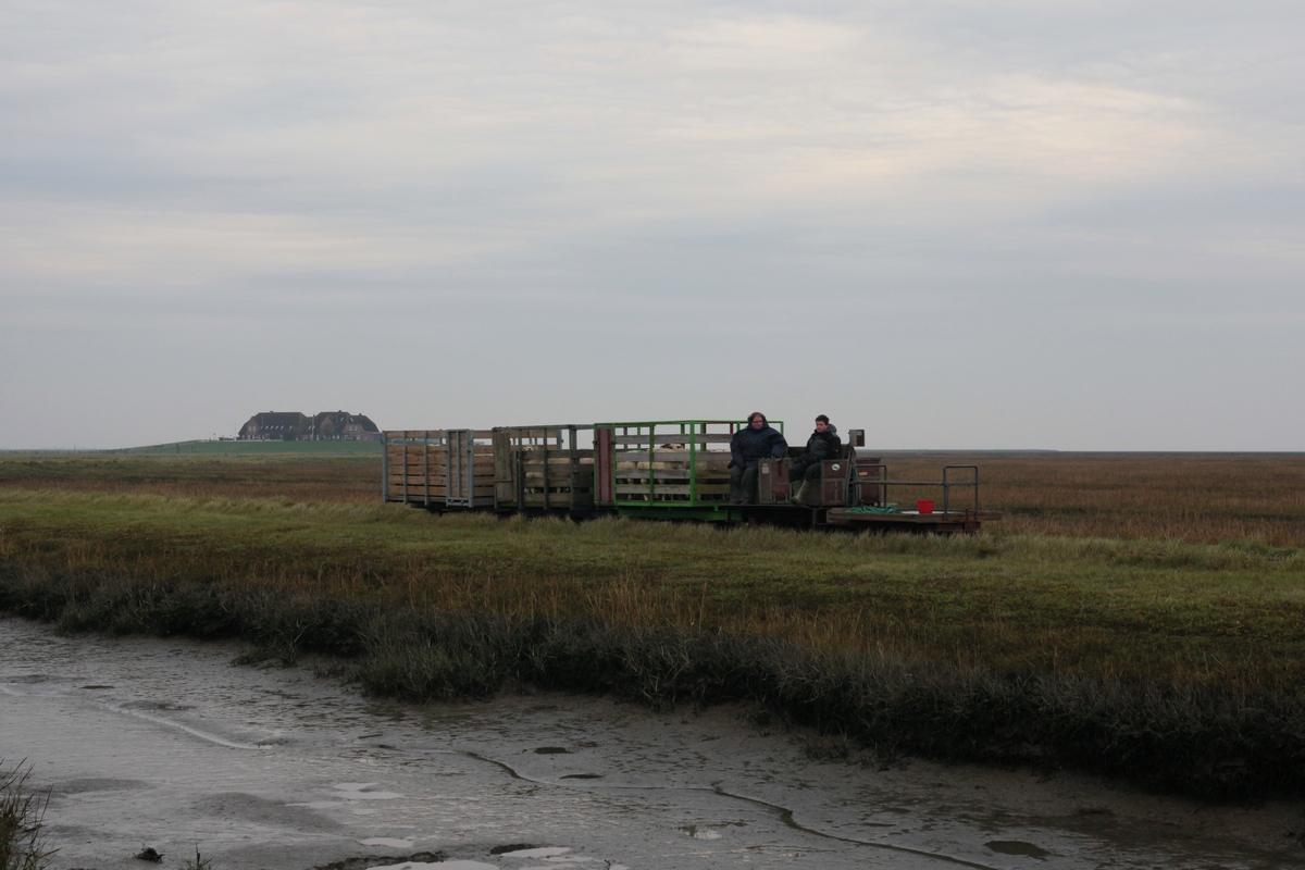 Und wieder Schafsverladung auf Hallig Nordstrandischmoor am 22.11.2014. Nur etwas stressiger für die Pensionsgäste, nach der Verladung in den Hänger an der Norderwarft, Umladung am Halligbf und nochmals Umladung auf Straßenfahrzeuge am Lüttmoorsiel. Das Ganze wurde auch noch vom NDR gefilmt und Aufn. ohne deren Wuschel am Stiel waren kaum möglich.