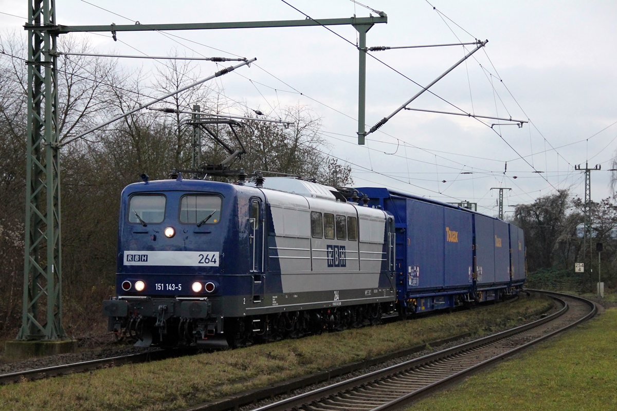 RBH Lok 264 ( 151 143 ) mit neuer Lackierung und  frischer Frist  (wenn ich es richtig gesehen hab 15.12.2015) bei der Durchfahrt in Baunatal Guntershausen aus Richtung Bebra kommend. 17.12.2015