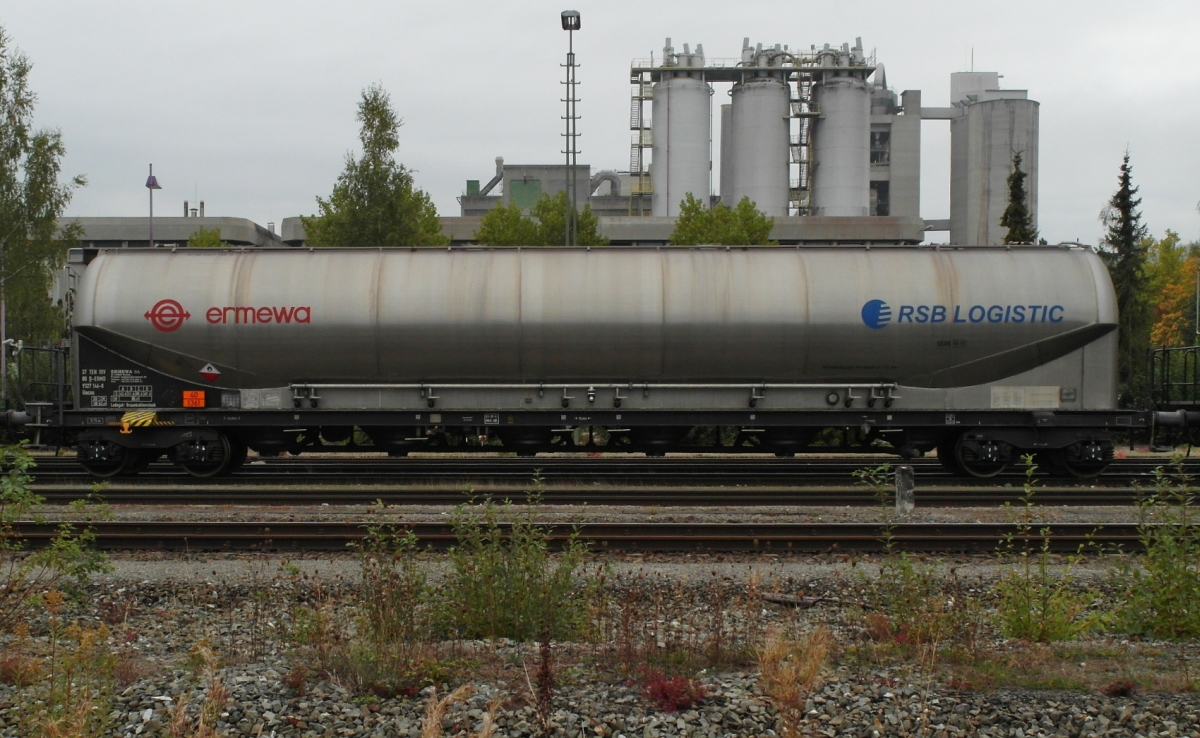 Ein Wagen für Braunkohlestaub, 37 TEN RIV 80 D-ERMD 9327 146-8 Uacns, eingestellt bei der ERMEWA SA, am 05.10.2015 im Bahnhof von Schelklingen.