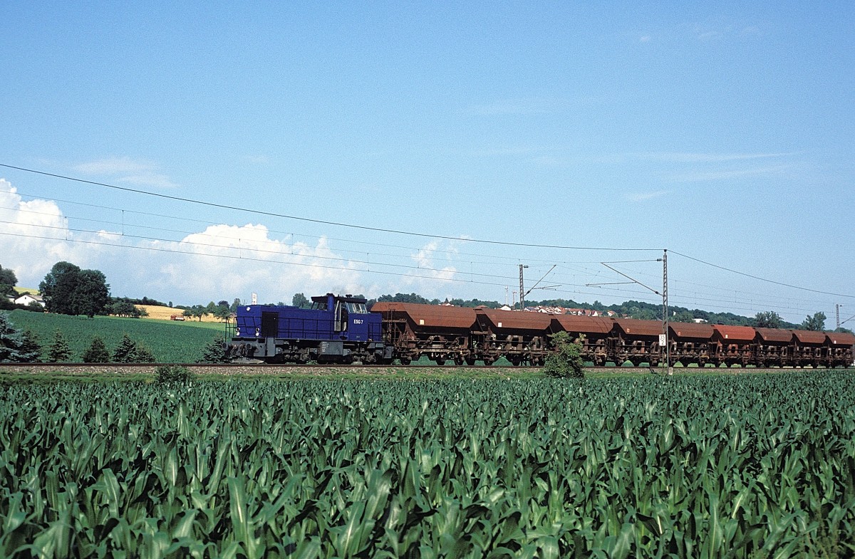 RBS: Über Zollikofen umgeleiteter Güterzug mit dem De 4/4 103 ab Lohn-Lüterkofen bei Grafenried im Sommer 1995.