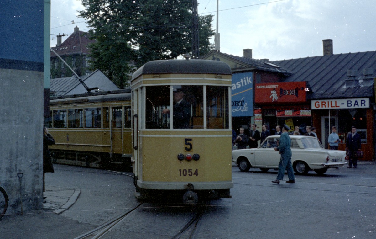 København / Kopenhagen Københavns Sporveje am 10. September 1967: Der Beiwagen 1054 und der Triebwagen 470 fahren nach einer Sonderfahrt (Fotofahrt) für die Mitglieder der Dänischen Gesellschaft für Straßenbahngeschichte von der Nørrebrogade rückwärts in den Betriebsbahnhof Nørrebro hinein. - Die beiden Wagen befinden sich heute in der Sammlung des Dänischen Straßenbahnmuseums. - Scan von einem Farbnegativ. Film: Kodacolor X. Kamera: Konica EE-matic.