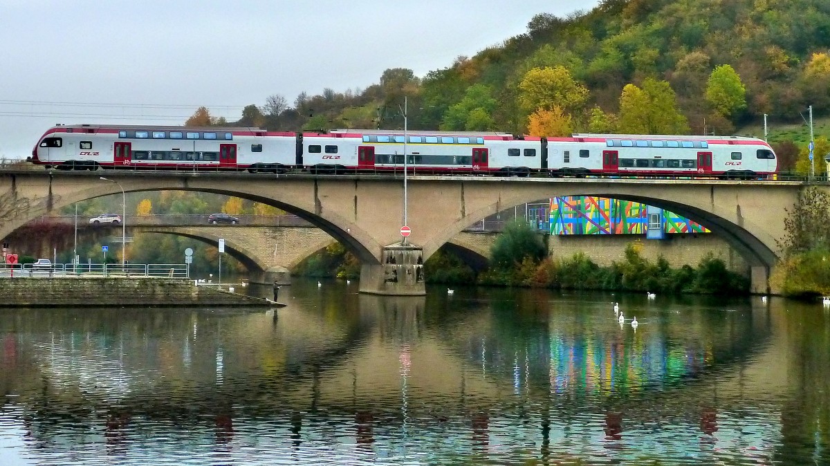Abgebügelter CFL 23xx Kiss von Wasserbillig (Luxemburg) nach Wasserbilligerbrück (Deutschland) auf der Brücke über die Sauer beim Umschalten von 25kV auf 15 kV. 31.10.2015
