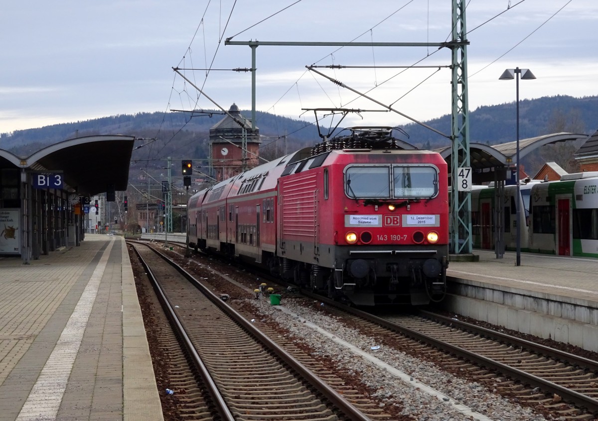 Abschied von der Saalebahn - 143 190-7 mit einer der letzten RBs von DB Regio nach Naumburg in Saalfeld (Saale) am 12. Dezember 2015.