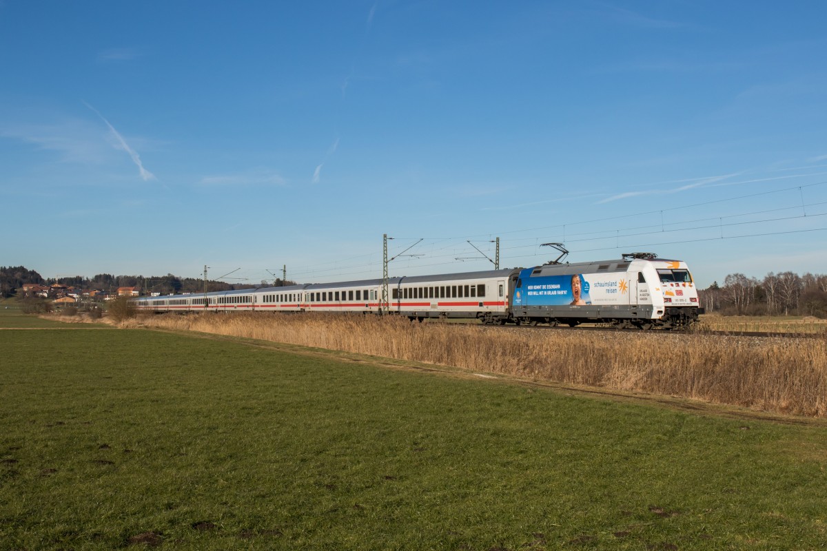 101 055 macht für "Schau ins Land Reisen" Werbung und ist damit beschäftigt, den EC 217 von Saarbrücken nach Graz zu fahren, hier zu sehen bei Bernau am Chiemsee am 28. Dezember 2015.