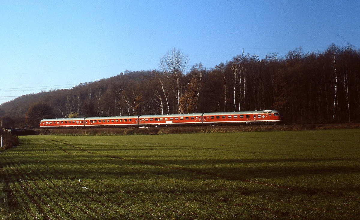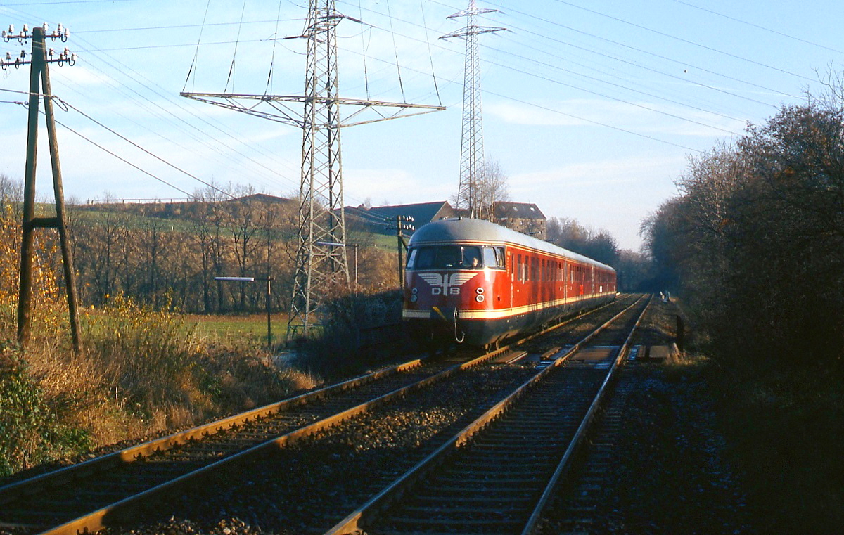 Zwischen Düsseldorf-Gerresheim und Erkrath Nord ist der DB-Museums-VT 08 als der "Neandertaler" bei einer Sonderfahrt im November 1986 unterwegs