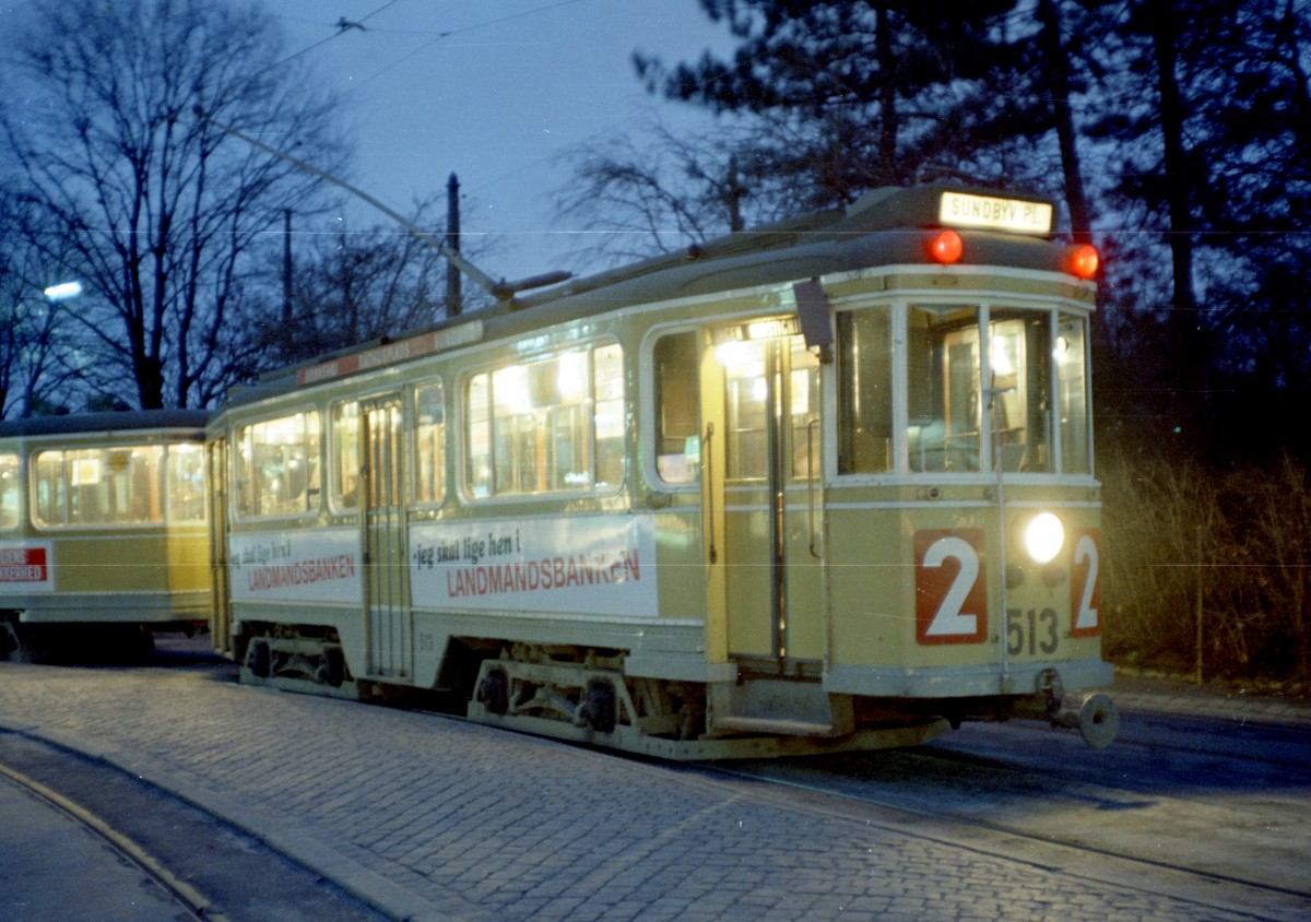 København / Kopenhagen Københavns Sporveje SL 2 (Tw 513) Brønshøj Torv (Endstation Brønshøj) im December 1967. - Scan von einem Farbnegativ. Film: Kodacolor X. Kamera: Konica EE-matic.