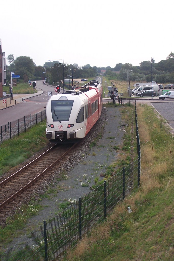 Harlingen /NL , 14.8.15. Nachschuß auf einen GTW2/8 von Arriva. Der Zug verläßt den Ort mit Ziel Leeuwarden.