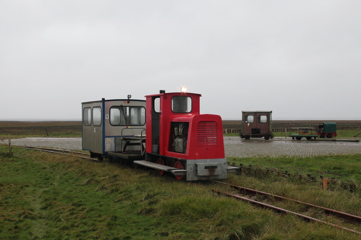 Schöma 2570 und Lore 1 haben nach dem Schafstransport wieder Nordstransischmoor erreicht und stehen jetzt auf dem Gleis zur Neuwarft. Auf dem Bild zu sehen 50% aller damals vorhandenen selbstfahrenden Privatfahrzeuge, im Halligbf stehen Lore 9 und 4, sowie die als Lore 3 eingeordnete Diema DL6. (16.11.2014)