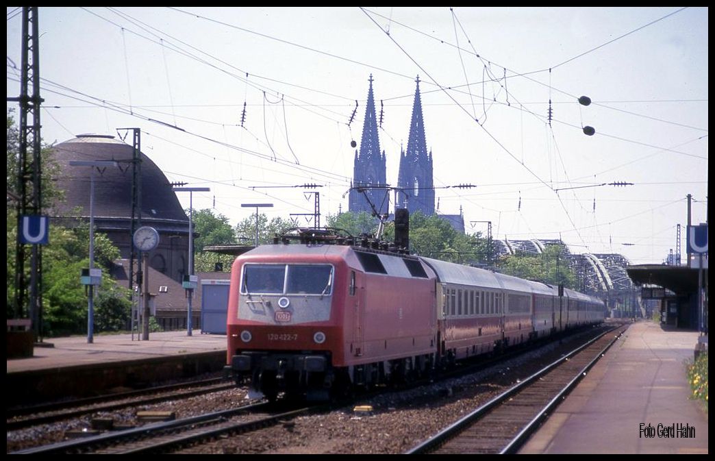 120122 bespannte am 21.5.1992 den IC 614 Drachenfels und war mit diesem hier um 14.35 Uhr in Köln - Deutz nach Münster unterwegs.