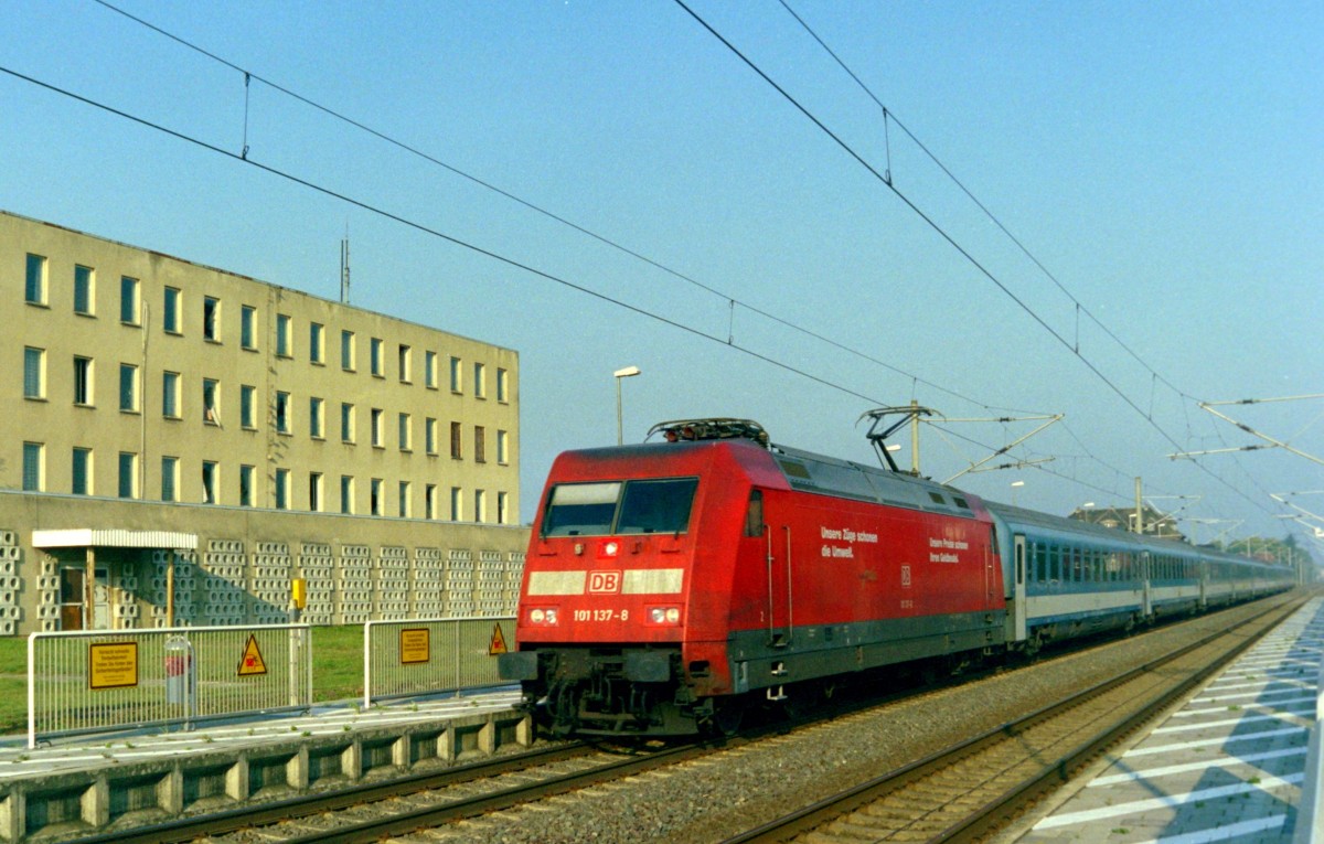 101 137 mit EC 175 (Hamburg-Altona–Budapest Keleti pu) am 08.10.2005 vor dem ehemaligen Grenzkontrollgebäude in Schwanheide